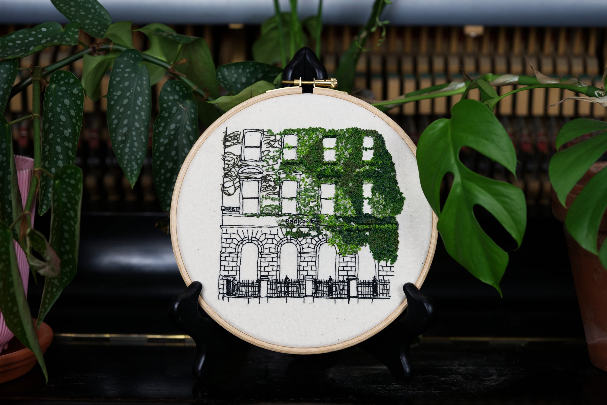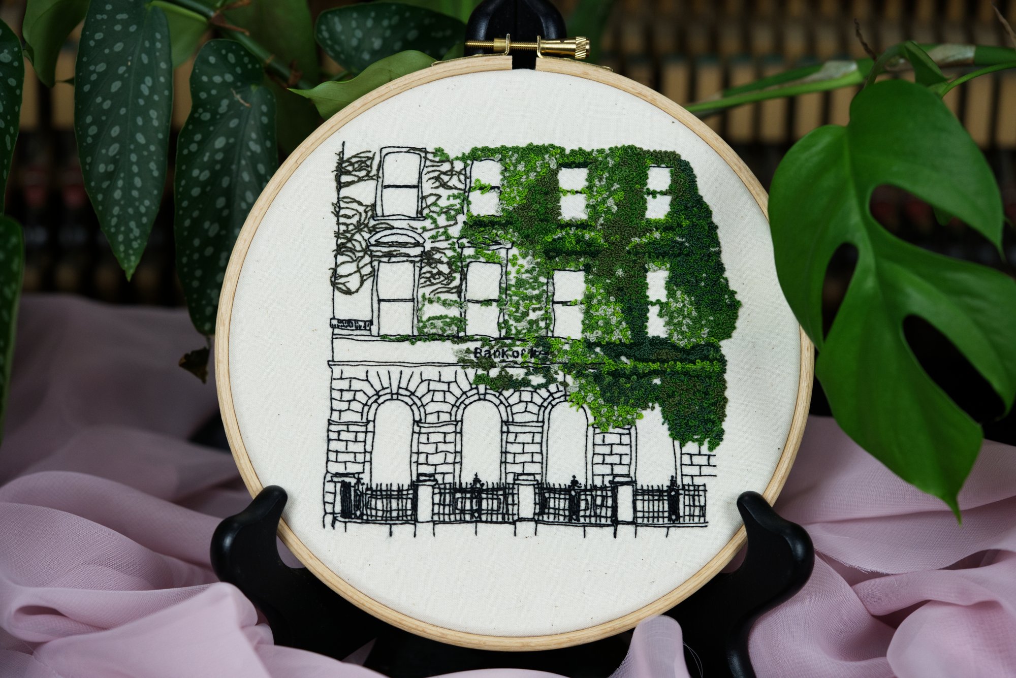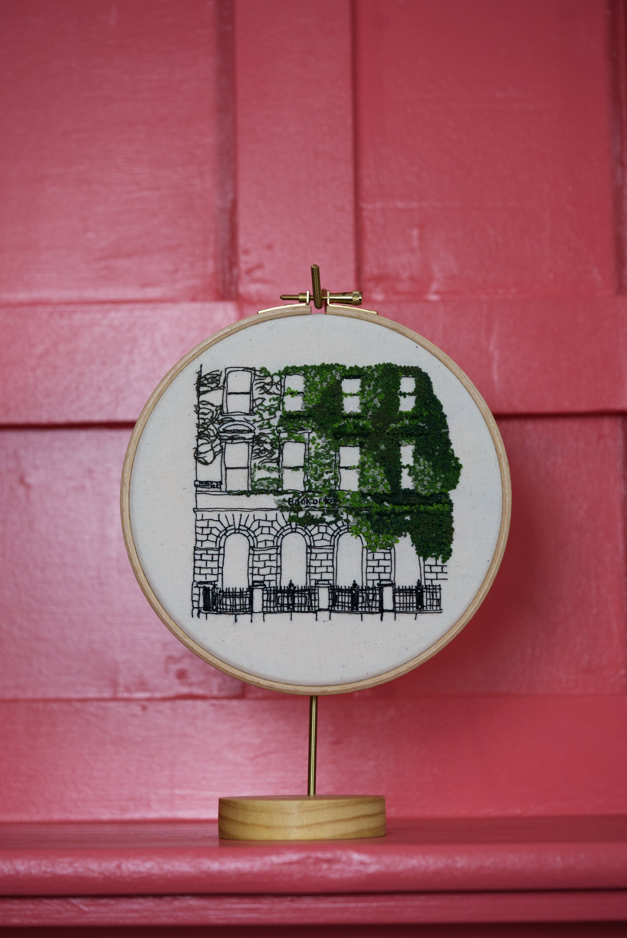 While in Dublin on my honeymoon I saw this old Bank of Ireland absolutely covered in ivy. I loved the contrast between the hard brick of the bank and the chaotic, almost fluffy seeming, leaves of ivy. This piece took about 6,500 french knots and 30-something hours to create the delicate, but overwhelming ivy and it's one of my favorite pieces I've made so far.