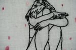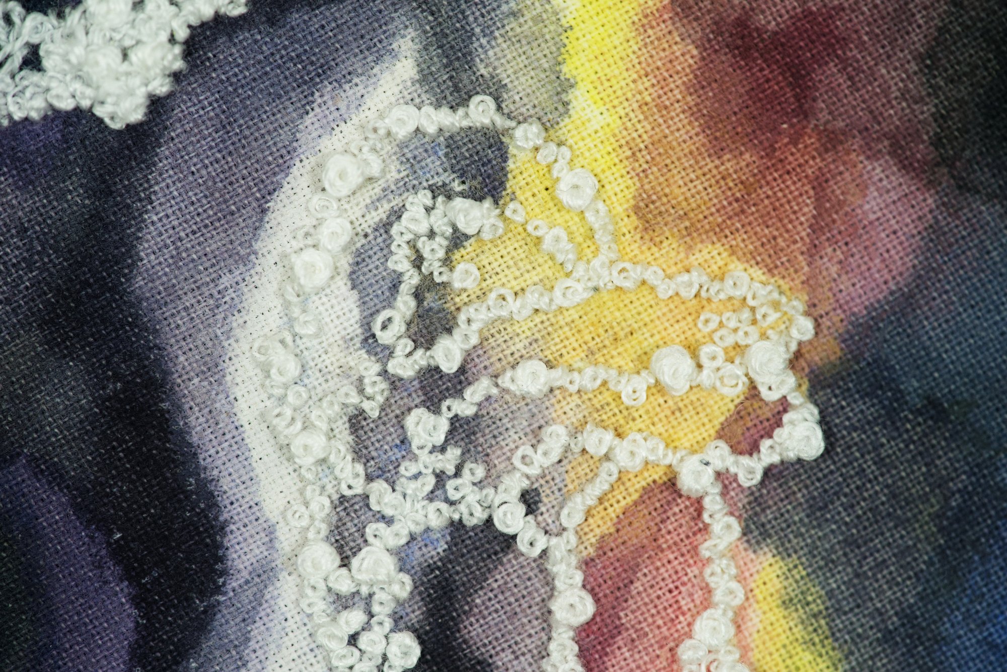 Wooden hoop embroidery, cotton thread and watercolor on linen.