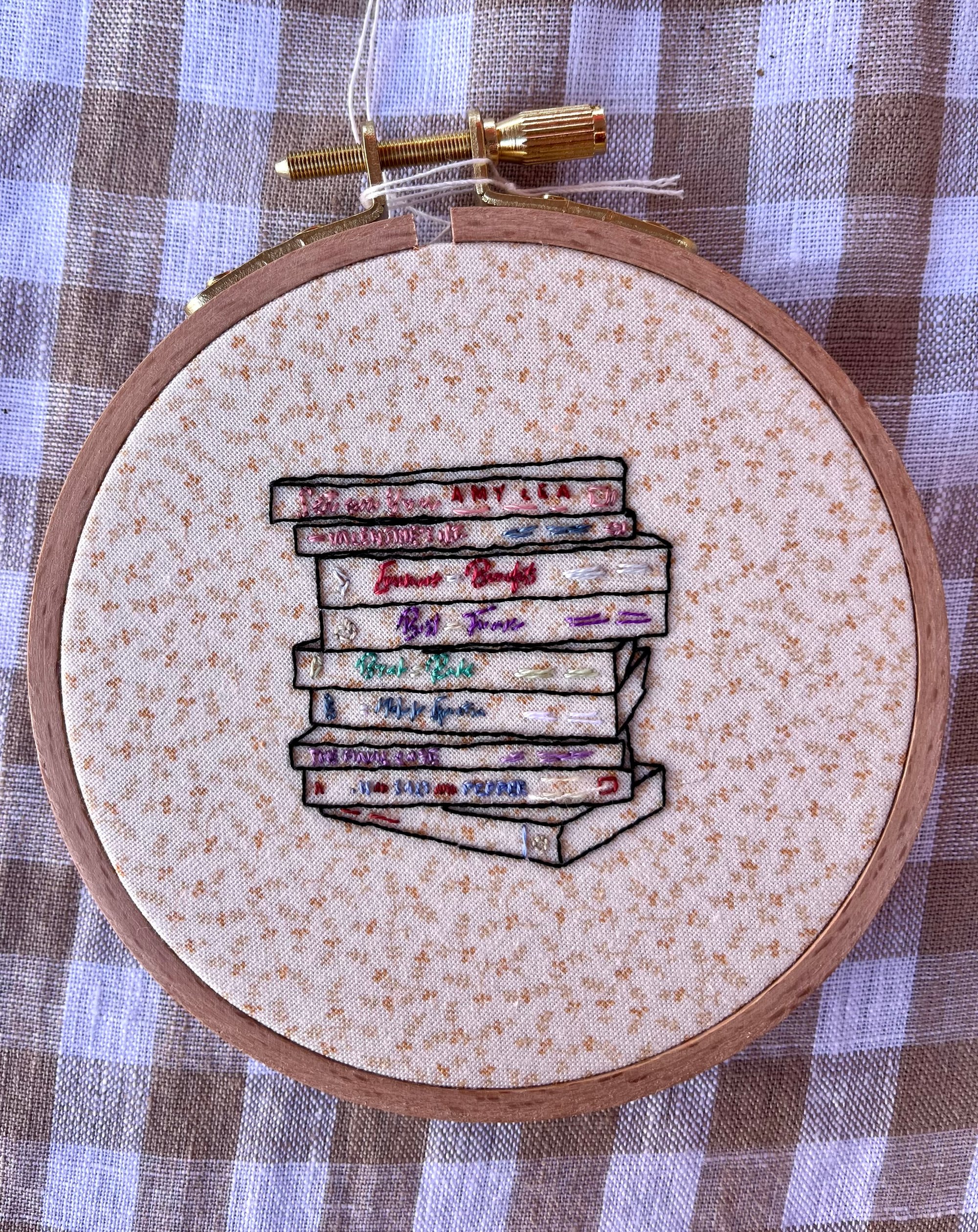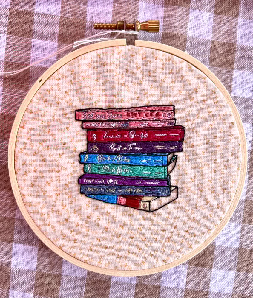 Each piece is made to order in about 1-2 weeks (plus shipping). Want to see this piece with a different background, different set of books or stitch type? See my commissions page for contact details and we can work together to make your ideal version of "tbr"!