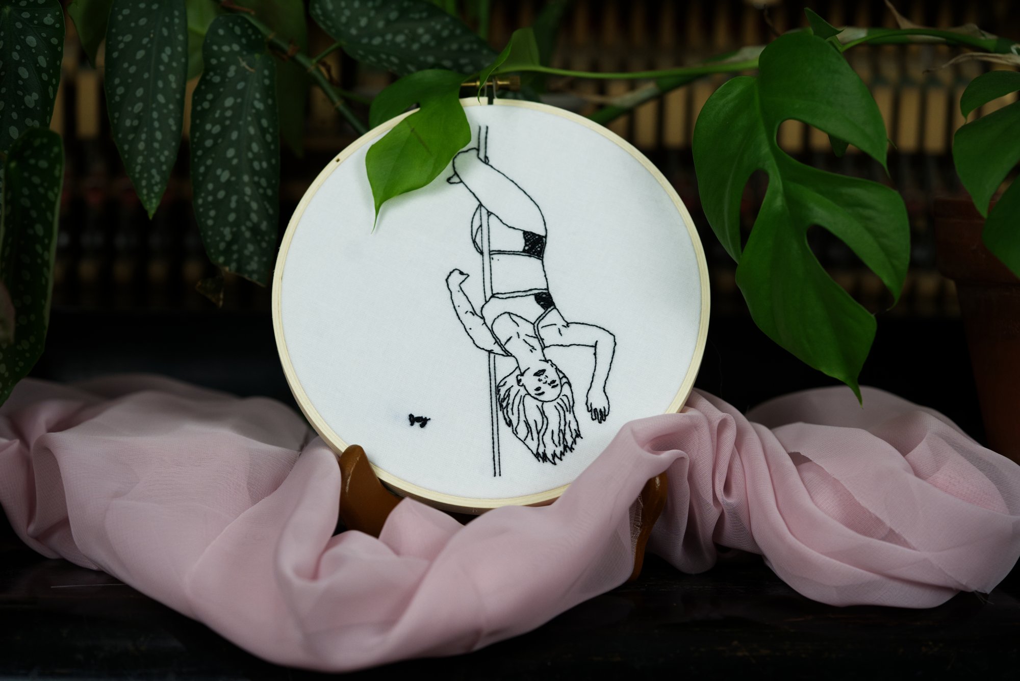 "Weightlessness" is one in a series based on a pole dance competition piece that I choreographed and performed in 2023 to the song "Swimming" by Pearl and the Beard. That song has a line, 'their weightlessness boring a hole', which I thought fit particularly well with this moment where I'm doing an outside leg hang.