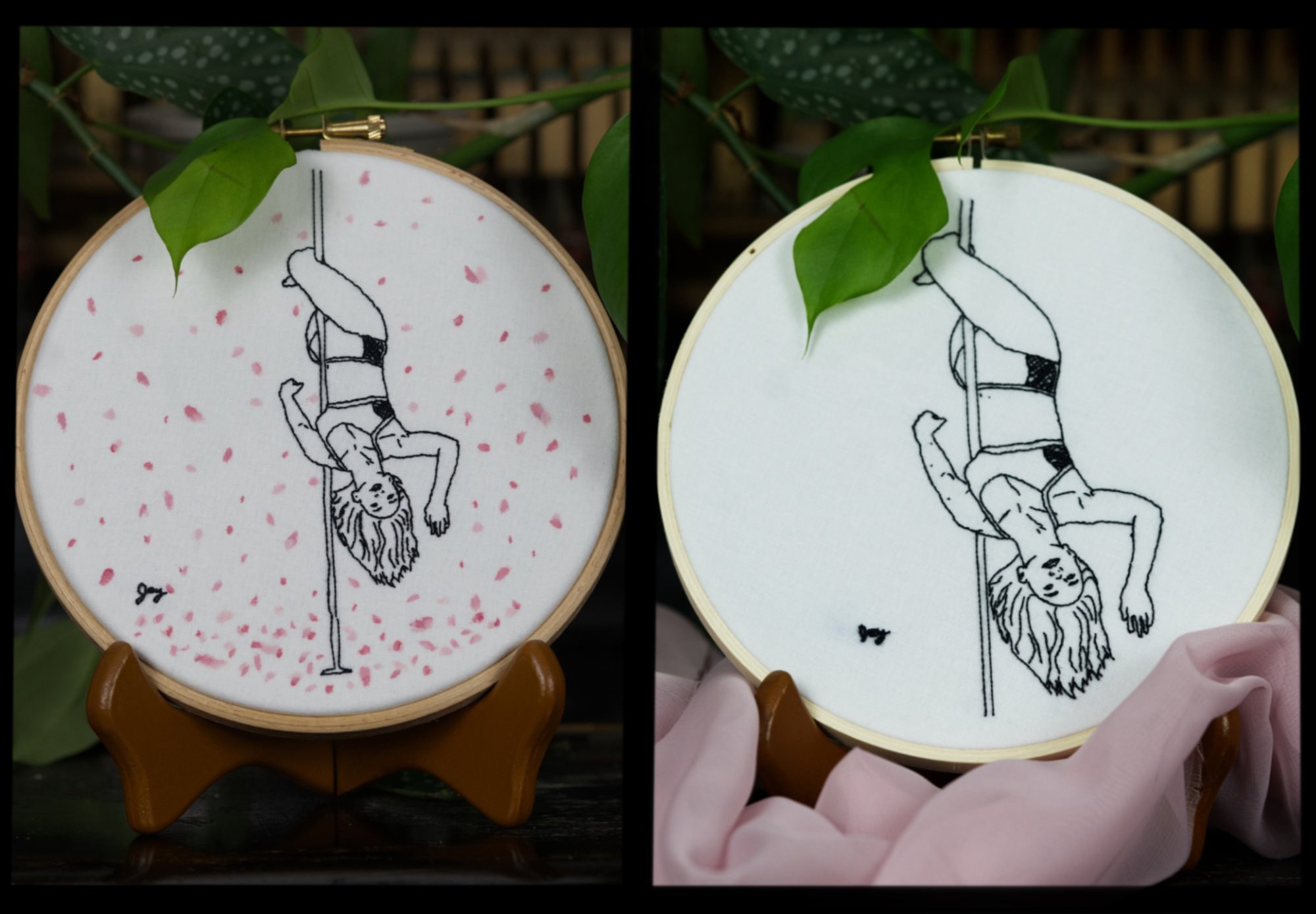 6" wooden hoop embroidery, cotton thread on linen. Pink petal variant includes a watercolor background.